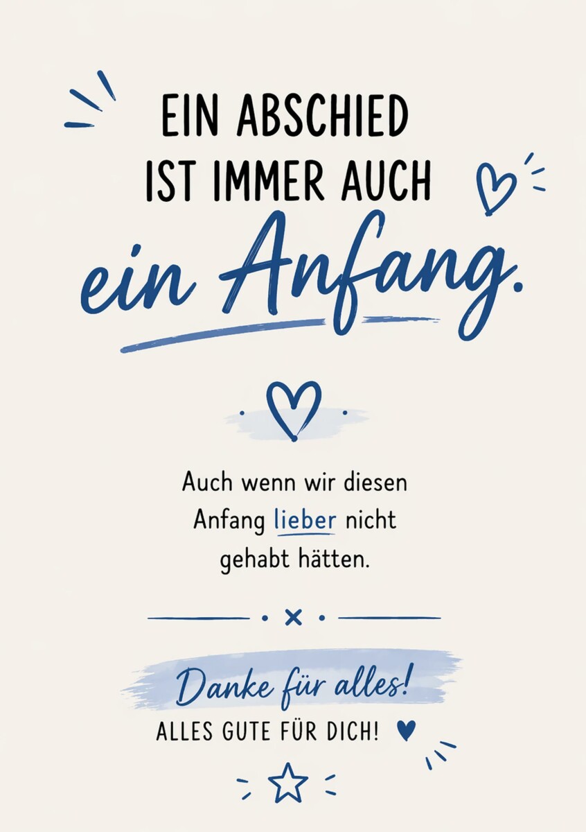 Diese stilvolle digitale Abschiedskarte „Ein Abschied ist immer auch ein Anfang“ ist die perfekte Wahl, um einem Kollegen oder einer Kollegin Danke zu sagen und alles Gute für den neuen Lebensabschnitt zu wünschen. Ob Jobwechsel, Ruhestand oder persönlicher Neuanfang – diese Karte verbindet Wertschätzung, Emotion und einen positiven Ausblick.