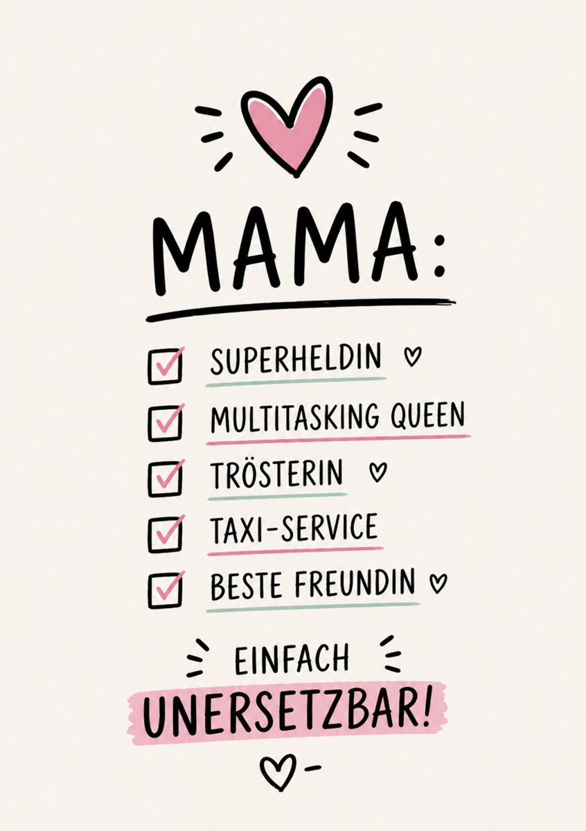 Du suchst eine besondere Muttertagskarte, die wirklich von Herzen kommt? Dann ist diese liebevoll gestaltete digitale Gruppengrußkarte genau das Richtige für dich. Mit der emotionalen Botschaft „Mama einfach unersetzbar“ und den typischen Mama-Rollen wie Superheldin, Multitasking Queen, Trösterin, Taxi-Service und beste Freundin bringst du garantiert ein Lächeln ins Gesicht deiner Mama.